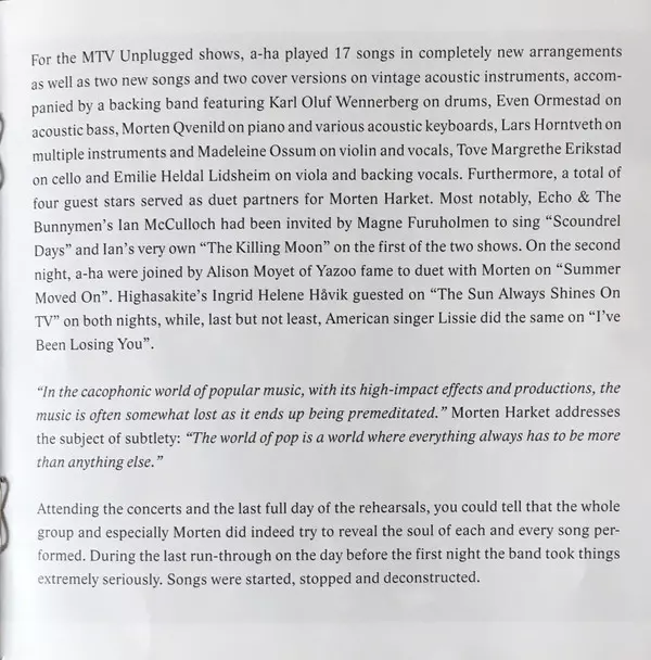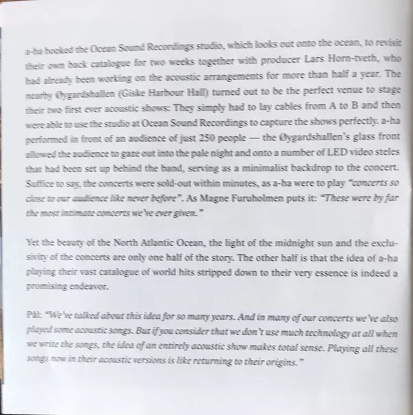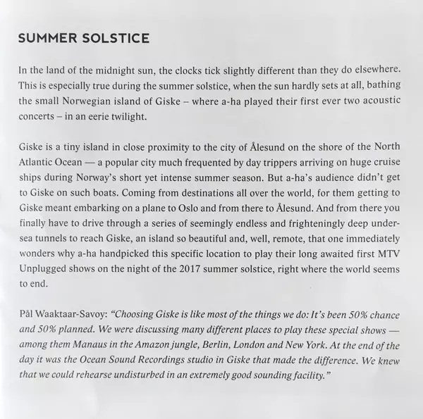 A new, acoustic chapter for a-haIn the land of the midnight sun, the clock is ticking differently. This is especially true on the days of the summer solstice, when it is almost dark - and Norway, and with it the small island of Giske, is bathed in a ghostly twilight at night. It was there that a-ha played the first two acoustic concerts of their career on the summer solstice in June 2017. There, the a-ha group embarked on a journey into their own past. The recording "MTV Unplugged - Summer Solstice" is now available in both video and audio formats. For fourteen days they rehearsed the acoustic arrangements, which their producer Lars Horntveth worked on for six months. In Øygardshallen, a-ha finally played in front of only 250 people. "They were by far the most intimate gigs we've ever had," explains Magne Furuholmen. But the beauty of the North Atlantic, the light of the midnight sun and the exclusivity of the event only tell half the story. The second storyline tells how a-ha embarked on new arrangements and reduced their songs to their compositional essence. Pål Waaktaar-Savoy: "We felt like we were going back to demo versions of our songs." And Magne adds: "Most of our songs are the result of influences we experienced in our childhood, when we were directly exposed to Norwegian culture, such as Nordic folk music. By coming back now, it was only a natural and logical step." In this context, Morten Harket refers to the central role of arranger and producer Lars Horntveth. For "MTV Unplugged - Summer Solstice", he changed the game as a catalyst and fearless mover in the background: "He peppered our music with completely new arrangements. He even touched on elements that we had declared 'untouchable'. Lars deserves credit for bringing us closer together as a band again - much more than ever before." During the MTV Unplugged concerts, a-ha played a total of 17 of their songs in brand new arrangements. Two new song premieres and two cover versions were also performed. a-ha and their backing band played exclusively on vintage acoustic instruments. A total of four prominent guest singers sang duets with Morten Harket. Ian McCulloch, lead singer and frontman of Echo & The Bunnymen, welcomed a-ha on stage during the first night with a grand gesture. Morten and Ian sang the songs "Scoundrel Days" and Echo & The Bunnymen's hit "The Killing Moon" together. On the second night, a-ha welcomed singer Alison Moyet from Yazoo, who sang "Summer Moved On" with Morten. Ingrid Helene Håvik of Highasakite was Morten's partner in the duet "The Sun Always Shines on TV" both nights. And last but not least, American singer Lissie performed the song "I've Been Losing You" together with Morten. There are few bands in the world that can boast as close a relationship with MTV as a-ha. Alongside Yello and Duran Duran, it was a-ha in particular who are now internationally regarded as the pioneers of the music video. The video for the song "Take On Me", directed by Steve Baron and now considered a classic, was voted by MTV viewers in 2003 as one of the Top 10 best music videos of all time. After endless final applause, a-ha leaves the stage and heads out into the day. They have just completed the second of their two triumphant acoustic concerts. By this point at the latest, it was clear to all concertgoers: a-ha had opened a new chapter in her unique career with "MTV Unplugged - Summer Solstice". a-ha's "MTV Unplugged - Summer Solstice" is available as a double-CD, 3-LP set, DVD and Blu-ray and also as a DVD or Blu-ray and double-CD set. For the true fans, there is also a Fan Box with double CD, DVD, Blu-ray and many interesting extras.