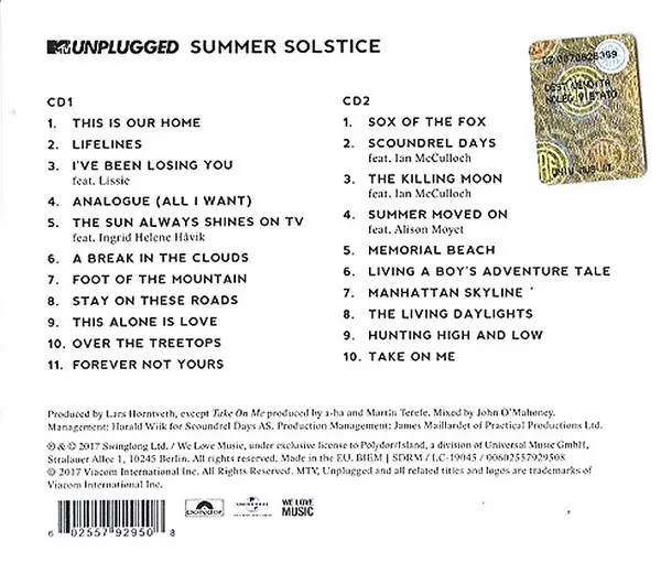 a-ha: MTV Unplugged (Summer Solstice) Die Version auf 2CD in Standard- Auflage. Diese besondere Auflage wurde veröffentlicht in Europa im Verlag Polydor In Zusammenarbeit mit Universal Music Group und We Love Music (3) am 6. Oktober 2017.