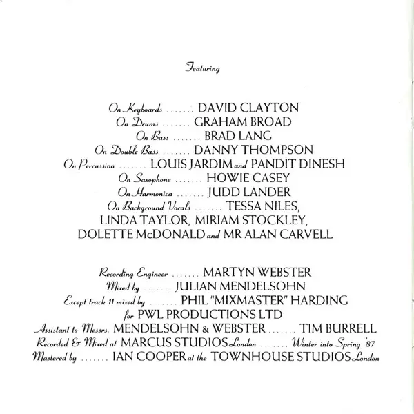 Engineer [Engineered By] Martyn Webster | Mixed By [For PWL Production Ltd.] Phil Harding | Producer [Produced By] Bernard Edwards, Mark White, Martin Fry