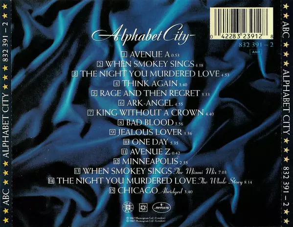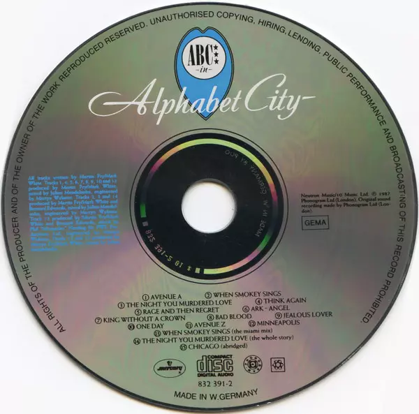 ABC: Alphabet City Die Version auf CD in Standard- Auflage. Diese besondere Auflage wurde veröffentlicht in Europa im Verlag Mercury In Zusammenarbeit mit Phonogram und Neutron Records Im Jahr 1987. Album Genres übergreifend Pop, Elektronische Musik und Synth-Pop.