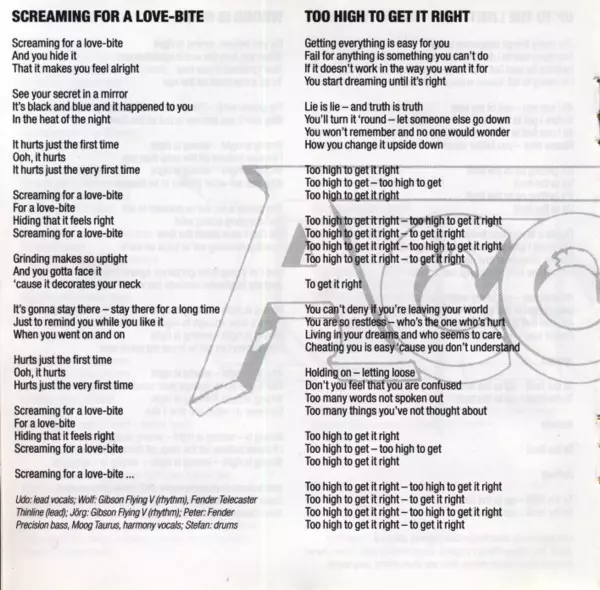 Bass [Fender Precision], Synthesizer [Moog Taurus], Backing Vocals Peter Baltes | Drums, Backing Vocals Stefan Kaufmann | Lead Vocals Udo Dirkschneider | Rhythm Guitar [Fender Strat/squire Strat], Lead Guitar [Strings & Things Strat], Backing Vocals Wolf Hoffmann | Rhythm Guitar [Gibson Flying V], Backing Vocals Jörg Fischer