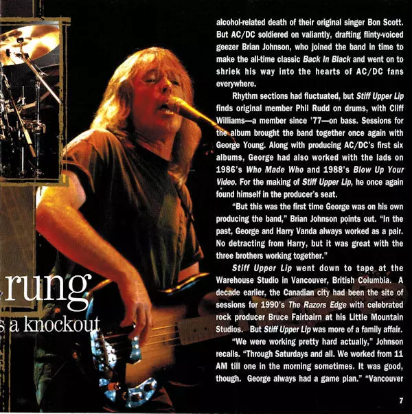 Stiff Upper Lip, released in 2000, was AC/DC's fifteenth studio album. The album was produced by George Young, the older brother of Angus and Malcolm Young. It was the band's first album since the death of original lead singer Bon Scott in 1980 and the first with Brian Johnson as lead singer. The album was a return to the band's hard rock roots ...