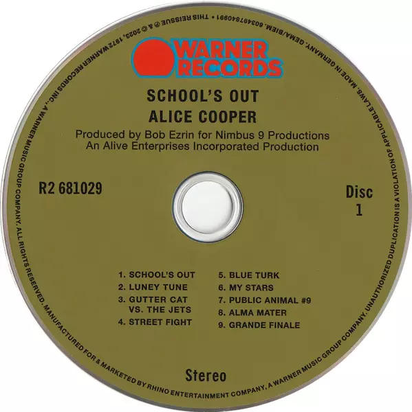 Alice Cooper: School's Out DLX Die Version auf 2CD in remastered deluxe Auflage. Diese besondere Auflage wurde veröffentlicht in Europa im Verlag Warner Records In Zusammenarbeit mit Rhino Records (2) am 9. Juni 2023.