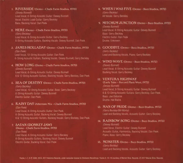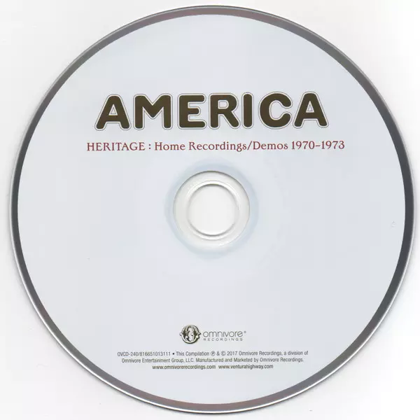 America: Heritage: Home Recordings/Demos 1970-1973 Die Version auf CD in Standard- Auflage. Diese besondere Auflage wurde veröffentlicht in USA im Verlag Omnivore Recordings am 17. November 2017. Album Genres übergreifend Rock, Folk-Rock und Soft Rock.