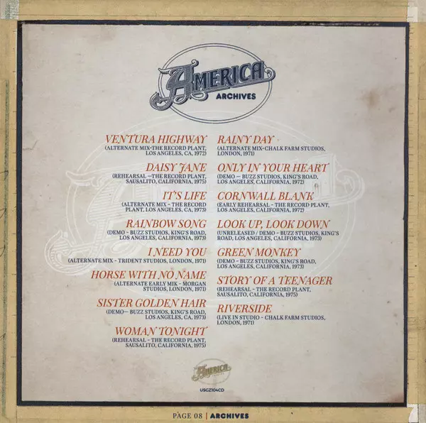 America: Archives (Vol1) Die Version auf CD in Standard- Auflage. Diese besondere Auflage wurde veröffentlicht in USA im Verlag America Records (8) am 23. August 2019. Album Genres übergreifend Rock, Pop, Pop Rock und Soft Rock.