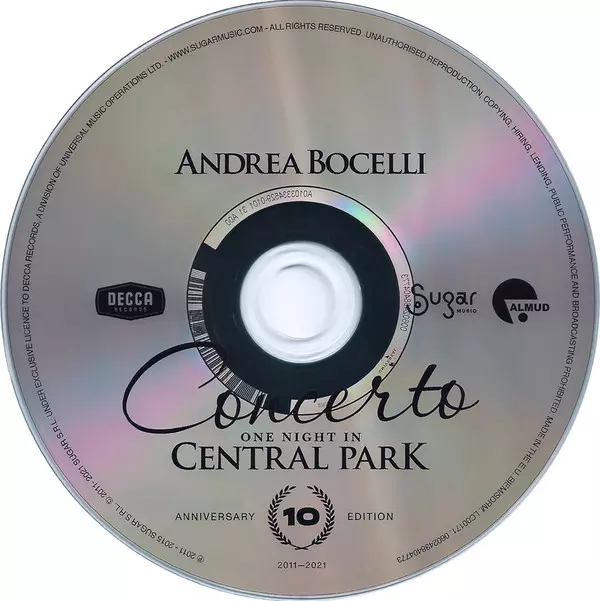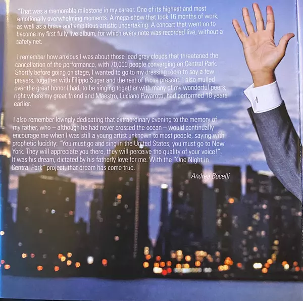 Andrea Bocelli, one of the most famous singers of all time, presents a special reworking of his Concerto album: One Night in Central Park capturing the graceful yet raw nature of the live album, which was lovingly recorded in New York City on September 15, 2011. It also features exceptional new performances, including a brand new recording of O Sole Mio