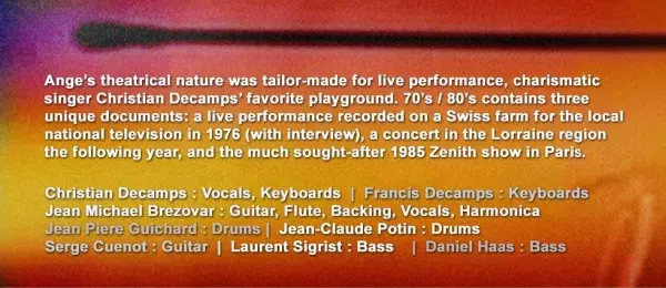 Ange is a French progressive rock band formed in 1969 by the Décamps brothers, Francis and Christian. Known for their theatrical stage presence and poetic French lyrics, Ange became one of the most popular French rock bands in the 1970s. Their music often incorporates elements of m...