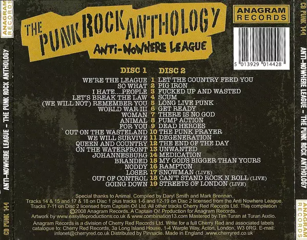 Anti-Nowhere League: The Punk Rock Anthology Die Version auf 2CD in Standard- Auflage. Diese besondere Auflage wurde veröffentlicht in UK im Verlag Anagram Records am 6. Juni 2025. Album Genres übergreifend Rock und Punk.