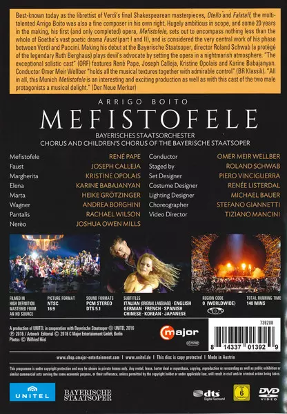 Arrigo Boito: Mefistofele Die Version auf DVD in Standard- Auflage. Diese besondere Auflage wurde veröffentlicht in Österreich im Verlag C Major In Zusammenarbeit mit Unitel am 25. November 2016. Album Genres übergreifend Klassische Musik, Stage & Screen, Romantik und Oper.