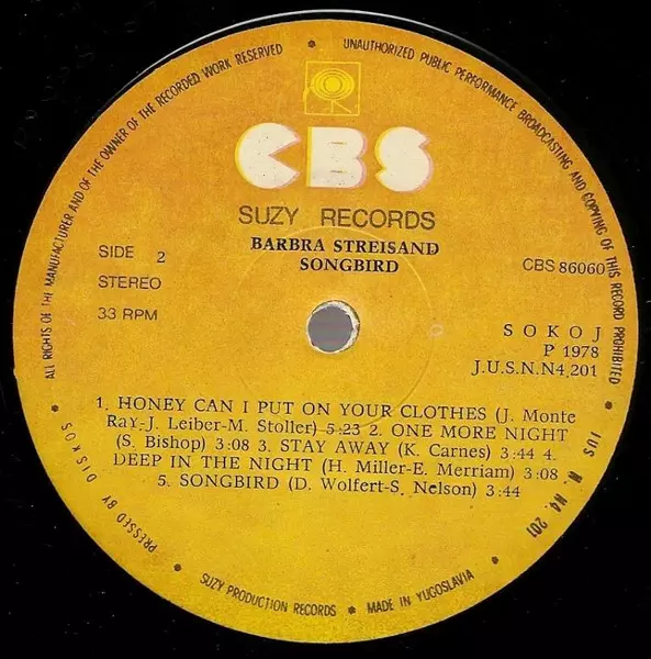Barbra Streisand: Songbird Die Version auf Vinyl LP in Standard- Auflage. Diese besondere Auflage wurde veröffentlicht in Jugoslawien im Verlag Suzy In Zusammenarbeit mit CBS Im Jahr 1979. Album Genres übergreifend Pop und Ballade.