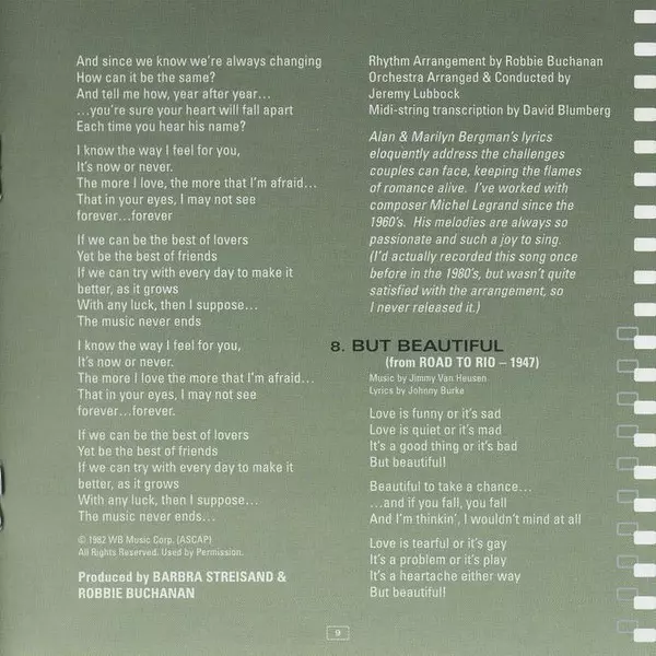 Arranged By, Conductor Jeremy Lubbock | Flugelhorn [Solo] Warren Luening | Producer Barbra Streisand | Written-By Jimmy Van Heusen, Johnny Burke