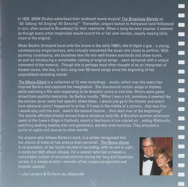 Barbra Streisand: The Movie Album Die Version auf CD in Standard- Auflage. Diese besondere Auflage wurde veröffentlicht in USA im Verlag Columbia am 9. Dezember 2003. Album Genres übergreifend Pop, Vokalmusik, Ballade und Music Hall.