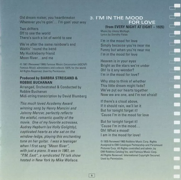 Producer Barbra Streisand | Producer, Arranged By, Conductor, Orchestrated By Robbie Buchanan | Transcription By [Midi-String] David Blumberg | Written-By Henry Mancini, Johnny Mercer
