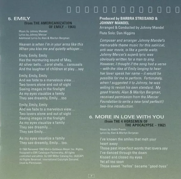 Flute [Solo] Dan Higgins | Producer Barbra Streisand | Producer, Arranged By, Conductor Johnny Mandel | Written-By Alan Bergman, Johnny Mandel, Johnny Mercer, Marilyn Bergman
