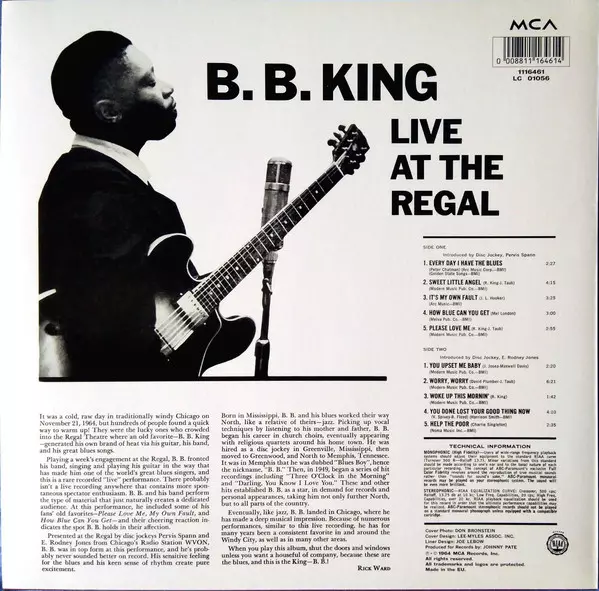 The album was recorded on November 21, 1964 at the Regal Theater in Chicago. It perfectly announces the exceptional talent of B. B. King as a singer, guitarist and entertainer. Rolling Stone" ranked it as the 141st greatest album of all time. "Live at the Regal" includes "Every Day I Have the Blues" and "Sweet Little Angel," among others, songs ...