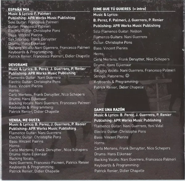 Backing Vocals Francesco G. Palmeri, Nani Guerrero | Bass Vincent Pierins | Drums Hans Eijkenaar | Electric Guitar Christophe Pons | Flamenco Guitar Nani Guerrero, Yoni Vidal | Horns Carlo Mertens, Frank Deruytter, Nico Schepers | Keyboards, Programmed By Didier Chapelle, Patrick Renier | Music By, Lyrics By Belle Perez, Nani Guerrero, Patrick Renier