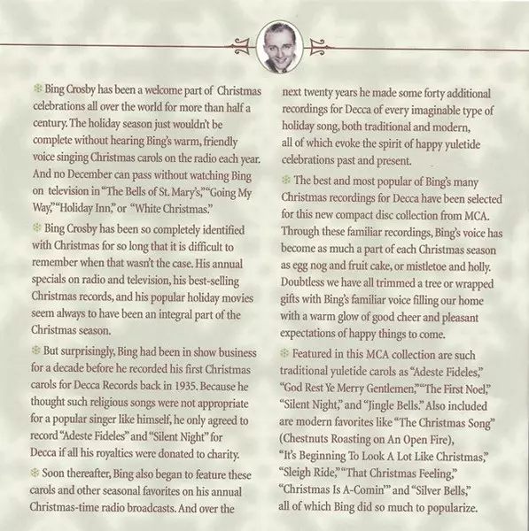 Bing Crosby: The Best Of Bing Crosby Die Version auf CD in remastered Auflage. Diese besondere Auflage wurde veröffentlicht in USA im Verlag MCA Records In Zusammenarbeit mit Chronicles am 7. Oktober 2004. Album Genres übergreifend Pop und Holiday.