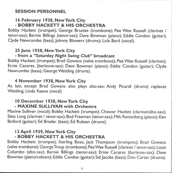 | Alto Saxophone Louis Colombo | Baritone Saxophone Ernie Caceres | Bass Sid Jacobs | Clarinet, Tenor Saxophone Pee Wee Russell | Drums Don Carter | Guitar Eddie Condon | Piano, Celesta Dave Bowman | Tenor Saxophone Bernie Billings | Trombone George Troup | Trumpet Jack Thompson (10), Sterling Bose | Valve Trombone Brad Gowans | Written-By Harold Orlob | |||