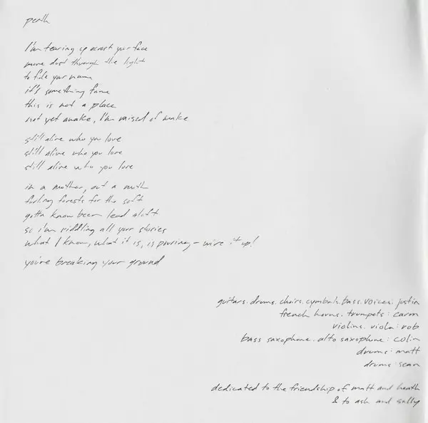 Effects [Re-201], Drums Matt McCaughan | Songwriter [With] Matt McCaughan | Synthesizer [Korg M1], Guitar [Tape Head], Guitar [High Strung], Voice, Bass, Electric Guitar, Baritone Guitar Justin Vernon | Voice [Phone Call] Kyle Frenette
