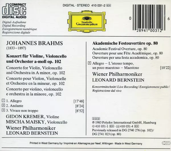 | Künstler | Wiener Philharmoniker | Leonard Bernstein | Johannes Brahms | Gidon Kremer | Mischa Maisky |