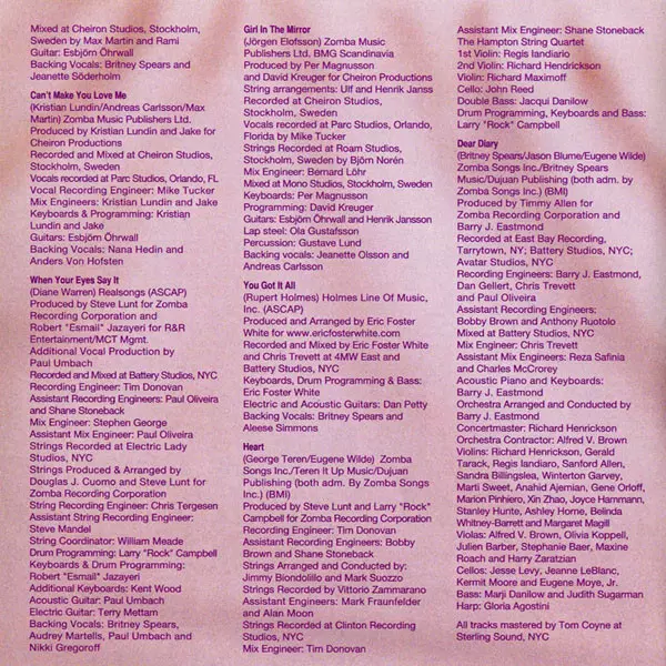 Arranged By [Orchestra] Barry Eastmond | Bass Judy Sugarman, Marji Danilow | Cello Eugene Moye, Jeanne LeBlanc, Jesse Levy, Kermit Moore | Concertmaster Richard Henrickson | Conductor Barry Eastmond | Contractor [Orchestra Contractor] Alfred Brown | Engineer [Assistant Mix Engineer] Charles McCrorey, Reza Safinia | Engineer [Assistant Recording Engineer] Anthony Ruotolo, Bob Brown (2) | Engineer [Mix Engineer] Chris Trevett | Engineer [Recording Engineer] Barry Eastmond, Chris Trevett, Dan Gellert, Paul Oliveira | Harp Gloria Agostini | Keyboards Barry Eastmond | Piano [Acoustic] Barry Eastmond | Producer Barry Eastmond, Timmy Allen | Viola Alfred Brown, Harry Zaratzian, Julien Barber, Maxine Roach, Olivia Koppell, Stephanie Fricker-Baer | Violin Anahid Ajemian, Ashley Horne, Belinda Whitney-Barratt, Gene Orloff, Gerald Tarack, Joyce Hammann, Margaret Magill, Marion Pinheiro, Marti Sweet, Regis Iandiorio, Richard Henrickson, Sandra Billingslea, Sanford Allen, Stanley Hunte, Winterton Garvey, Xin Zhao | Written-By Britney Spears, Eugene Wilde, Jason Blume