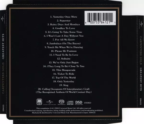 Carpenters: Carpenters Gold (Greatest Hits) Die Version auf SACD in Standard- Auflage. Diese besondere Auflage wurde veröffentlicht in Hongkong im Verlag A&M Records In Zusammenarbeit mit Universal Music Hong Kong am 10. August 2018. Album Genres übergreifend Pop, Vokalmusik, Ballade und Pop Rock.