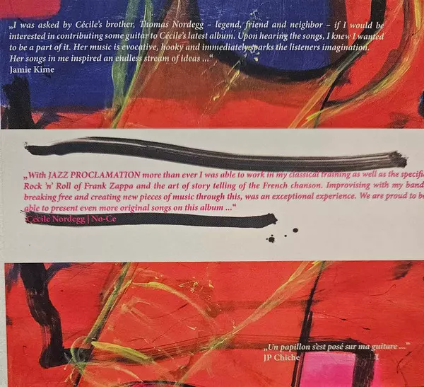 Cécile Nordegg: Jazz Proclamation Vol.1 + 2 Die Version auf CD in Standard- Auflage. Diese besondere Auflage wurde veröffentlicht in Österreich im Verlag Rossori Music am 16. Juni 2018. Album Genres übergreifend Pop, Jazz, Contemporary Jazz und Chanson.