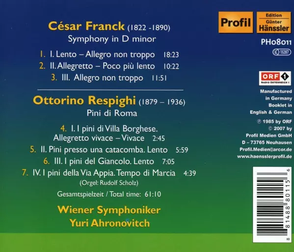 | Künstler | Ottorino Respighi | Wiener Symphoniker | César Franck | Yuri Ahronovitch |