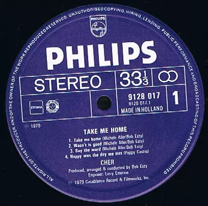 Cher: Take Me Home Die Version auf Vinyl LP in Standard- Auflage. Diese besondere Auflage wurde veröffentlicht in Niederlande im Verlag Philips Im Jahr 1979. Album Genres übergreifend Rock, Funk / Soul und Disco.