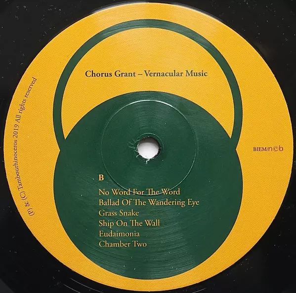 Chorus Grant: Vernacular Music Die Version auf Vinyl LP in Standard- Auflage. Diese besondere Auflage wurde veröffentlicht in Dänemark im Verlag Tambourhinoceros am 4. Oktober 2019. Album Genres übergreifend Pop und Folk, World, & Country.
