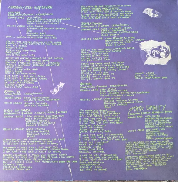 Effects [Lead Musak], Keyboards [Squeeky (sic) Rhythm Keyboard], Effects [Layered Corporation], Vocals [Chorus], Cymbal [Backwards Hi Hat], Drums, Keyboards [Moog] Damon Edge | Lead Vocals [Verse], Vocals [Megaphone], Guitar [Machine Guitar], Guitar [Mutated Guitars], Bass, Keyboards [Chorus Yamaha Keyboard] Helios Creed | Music By, Words By Damon Edge, Helios Creed
