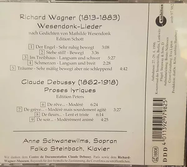 | Künstler | Claude Debussy | Richard Wagner | Anne Schwanewilms | Falko Steinbach |