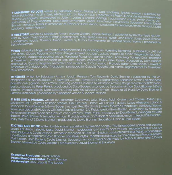Arranged By [Orchestra] David Bronner | Backing Vocals Dag Lundberg, Florence Arman, Nicklas Lif, Sebastian Arman | Conductor [Orchestra] Pejtsik Péter | Drums Christoph Stadler (2) | Edited By [Protools Editor] Cécile Desnos, Dorothee Badent, Molly Moldan | Keyboards, Programmed By [Programming] Dag Lundberg, David Bronner, Nicklas Lif | Mixed By David Bronner, Dietmar Tinhof, Patrick Kummeneker | Mixed By [Assisted By] Cécile Desnos | Mixed By [Orchestra] Dietmar Tinhof | Producer David Bronner, Lost Kids (3) | Producer [Additional Vocal Production] Dorothee Badent, Sebastian Arman | Producer [Orchestra] Dorothee Badent | Recorded By Lost Kids (3), Mac Desi | Recorded By [Drums] Cécile Desnos, Molly Moldan | Recorded By [Orchestra] Kurina Tamás | Written-By Dag Lundberg, Johannes Henriksson, Nicklas Lif, Richard Andersson (7)