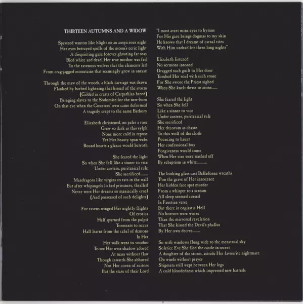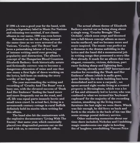 Cruelty and the Beast by Cradle of Filth is a gothic metal album released in 1998. The album is based on the legend of Vlad the Impaler, also known as Count Dracula. The album has a dark and heavy sound and the lyrics tell the story of Vlad the Impaler. The album was a critical and commercial success and is cited as one of the best gothic metal albums of all time.