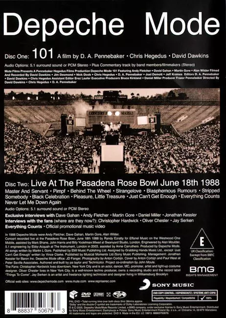 Legendary concert film D. A. Pennebaker's "101" on DVD. This outstanding tour documentary and footage of Depeche Mode's concert at the Rose Bowl on June 18, 1988 was already considered a milestone in concert film history when it was first released in 1989. Review by J. Fischer in Audio 12/03: "The film is still exciting today. It shows pop stars...