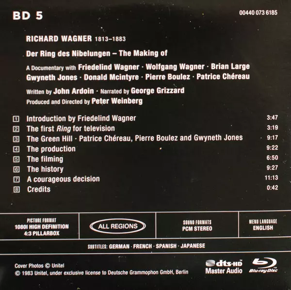 Camera Operator Franz Knoll (2), Fritz Beckhoff | Executive-Producer Philippe Deriaz | Featuring Brian Large, Donald McIntyre, Friedelind Wagner, Gwyneth Jones, Jeannine Altmeyer, Jeffrey Tate, Patrice Chéreau, Pierre Boulez, William Mann, Wolfgang Wagner (6) | Film Producer, Film Director Peter Weinberg | Narrator George Grizzard | Technician [Sound] Leonardo Ruschin, Peter Kellerhals, Rolf Peter Schröder | Written-By John Ardoin