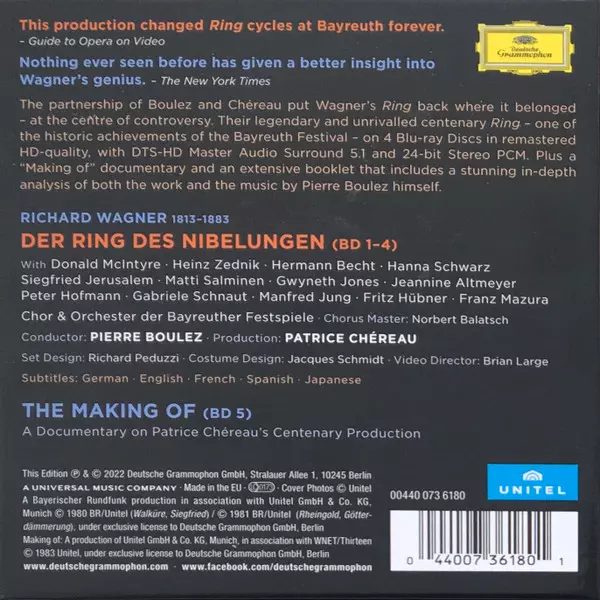 Richard Wagner: Der Ring Des Nibelungen Die Version auf Box Set/5Blu-ray in remastered Auflage. Diese besondere Auflage wurde veröffentlicht in Europa im Verlag Deutsche Grammophon am 22. Juli 2022. Album Genres übergreifend Klassische Musik, Romantik und Oper.