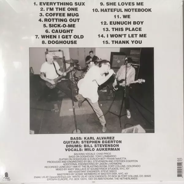 Descendents : Everything Sucks is an album released in 1996. It is the band's sixth studio album. The album was recorded in February 1996 at The Blasting Room in Fort Collins, Colorado. It was produced by Bill Stevenson and Jason Livermore. The album was released on July 30, 1996 by Epitaph Records. The album reached number 128 on the Billboard ...