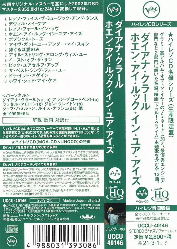 On her debut album for Verve, Diana Krall performs with a jazz band in beautiful orchestral arrangements by Johnny Mandel. The album When I Look In Your Eyes was recorded by the legendary Al Schmitt and features some of Diana's most famous performances, including "Let's Face The Music and Dance" and "I've Got You Under my Skin". If art is about ...