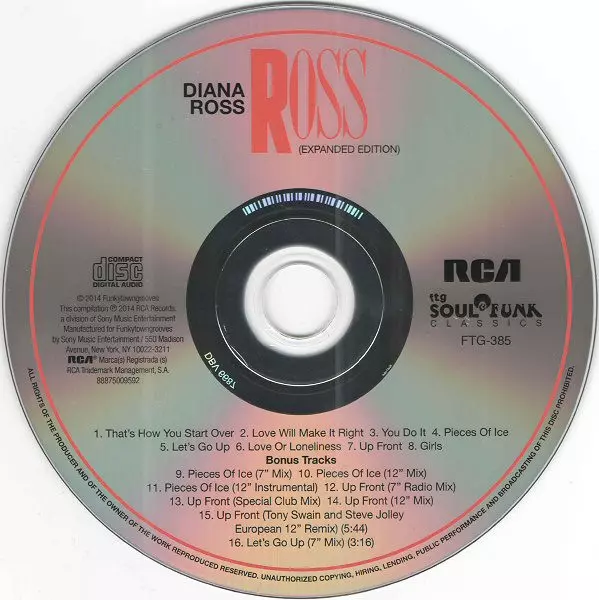 Diana Ross: Ross Die Version auf CD in remastered Auflage. Diese besondere Auflage wurde veröffentlicht in USA im Verlag Funkytowngrooves In Zusammenarbeit mit RCA und Sony Music Commercial Music Group am 8. März 2019. Album Genres übergreifend Pop, Funk / Soul, Ballade, Rhythmus und Blues, Soul, Funk und Disco.