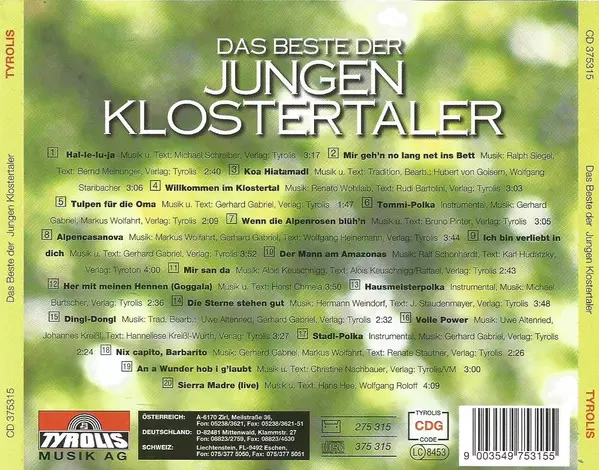 Die Jungen Klostertaler: Das Beste Der Jungen Klostertaler Die Version auf CD in Standard- Auflage. Diese besondere Auflage wurde veröffentlicht in Schweiz im Verlag Tyrolis am 21. März 1996. Album kann als folgendes Genre klassifiziert werden Folk, World, & Country.