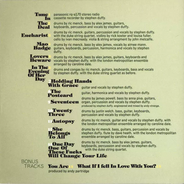 Cello Ivan McCready | Drums Ric Menck | Featuring [With] The Duke Quartet | Guitar, Percussion, Vocals Stephen Duffy | Viola, Arranged By [Strings] John Metcalfe | Violin Louisa Fuller, Rick Koster