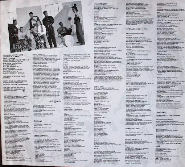 Alto Saxophone, Tenor Saxophone Andrew Woolfolk, Gary Bias | Arranged By [Horns] Bill Meyers | Backing Vocals Jeanette Hawes, Josie James, Wanda Vaughn | Co-producer Frankie Blue, Les Pierce | Guitar Sheldon Reynolds | Guitar, Percussion Frankie Blue | Keyboards, Synthesizer, Drum Programming, Arranged By Les Pierce | Lead Vocals, Percussion, Vocoder, Kalimba Maurice White | Trombone Reggie Young (2) | Trumpet Jerry Hey, Oscar Brashear | Written-By Frankie Blue, Les Pierce, Maurice White
