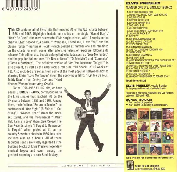 Elvis Presley: Number One U.S. Singles 1956-62 LTD Die Version auf CD in limitierte remastered Auflage. Diese besondere Auflage wurde veröffentlicht im Verlag State Of Art (2) am 19. Mai 2017.
