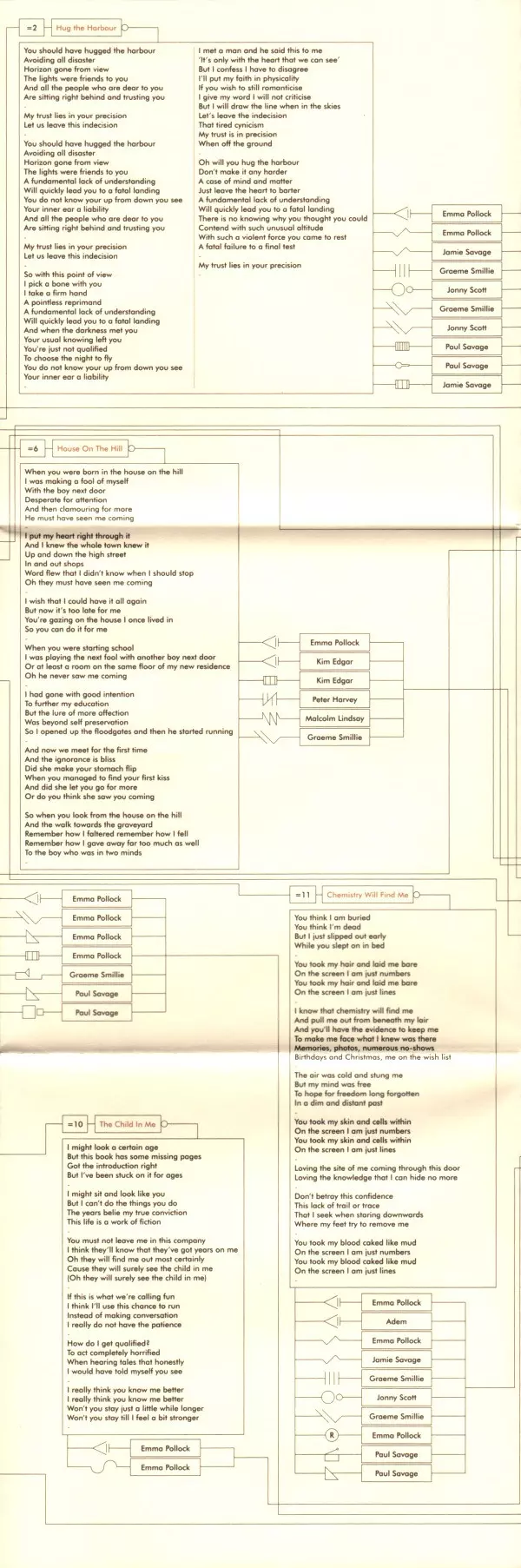 Bass, Vibraphone Graeme Smillie | Drums Jonny Scott | Electric Guitar, Piano Jamie Savage | Glockenspiel, Percussion Paul Savage | Vocals, Electric Guitar, Piano Emma Pollock