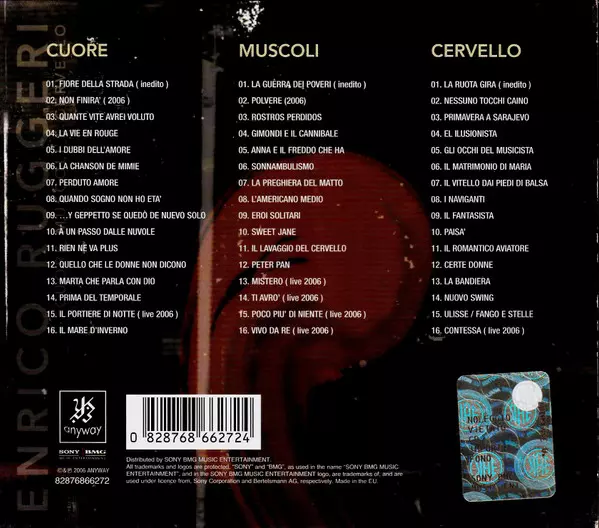 Enrico Ruggeri: Cuore Muscoli E Cervello Die Version auf 3CD in Standard- Auflage. Diese besondere Auflage wurde veröffentlicht in Italien im Verlag ANYWAY In Zusammenarbeit mit Sony BMG Music Entertainment am 16. April 2013. Album Genres übergreifend Rock, Pop, Vokalmusik, Pop Rock und Soft Rock.