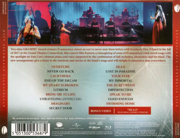Evanescence live with orchestra After releasing their orchestral comeback album "Synthesis" last year, Evanescence is finally coming live. "Synthesis Live" is the title of the concert film that was shot on their world tour last fall at Foxwoods Resort Casino Grand Theater in Connecticut. P.R. Brown was the director for this evening. Craig Ziogas...
