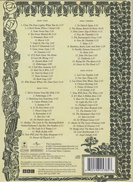 Fairport Convention: Live At The BBC Die Version auf 4CD in Standard- Auflage. Diese besondere Auflage wurde veröffentlicht in UK im Verlag Island Remasters In Zusammenarbeit mit Island Records und Universal Music Catalogue am 24. April 2007. Album Genres übergreifend Rock, Folk, World, & Country, Folk und Folk-Rock.
