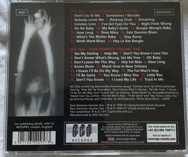 Fats Domino: Rare Dominos Volumes 1 & 2 Die Version auf CD in Standard- Auflage. Diese besondere Auflage wurde veröffentlicht in UK im Verlag BGO Records am 14. Februar 2011. Album Genres übergreifend Rock, Blues, Rhythmus und Blues, Rock & Roll und Boogie Woogie.
