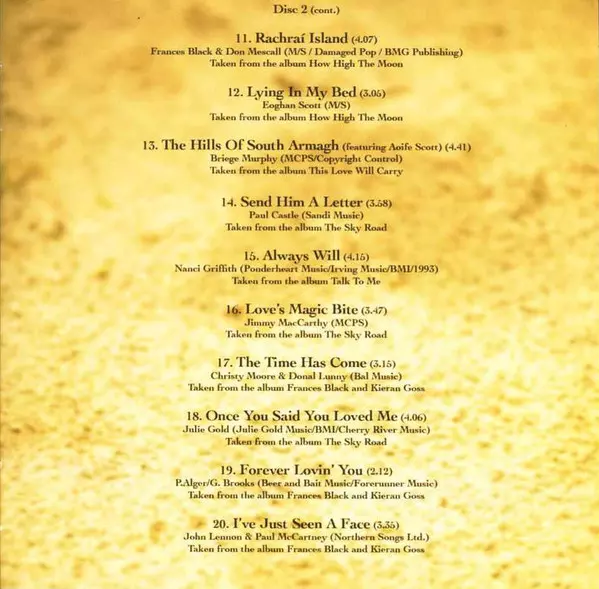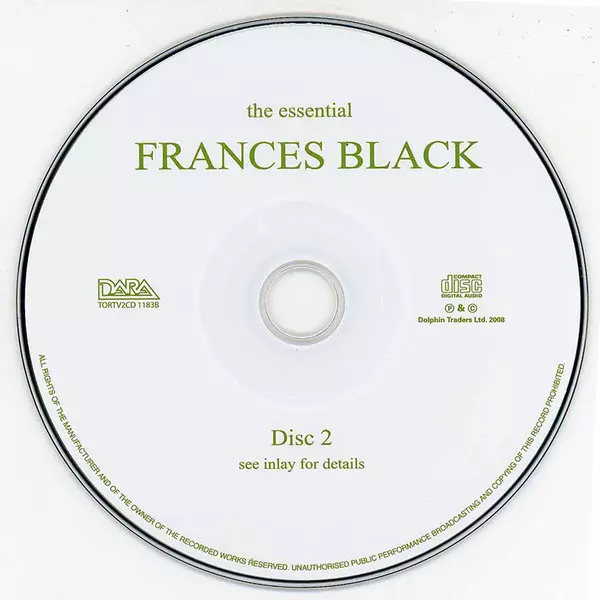 Frances Black: The Essential Frances Black Die Version auf 2CD in Standard- Auflage. Diese besondere Auflage wurde veröffentlicht in Irland im Verlag Dara Records am 4. Mai 2010. Album kann als folgendes Genre klassifiziert werden Folk, World, & Country.